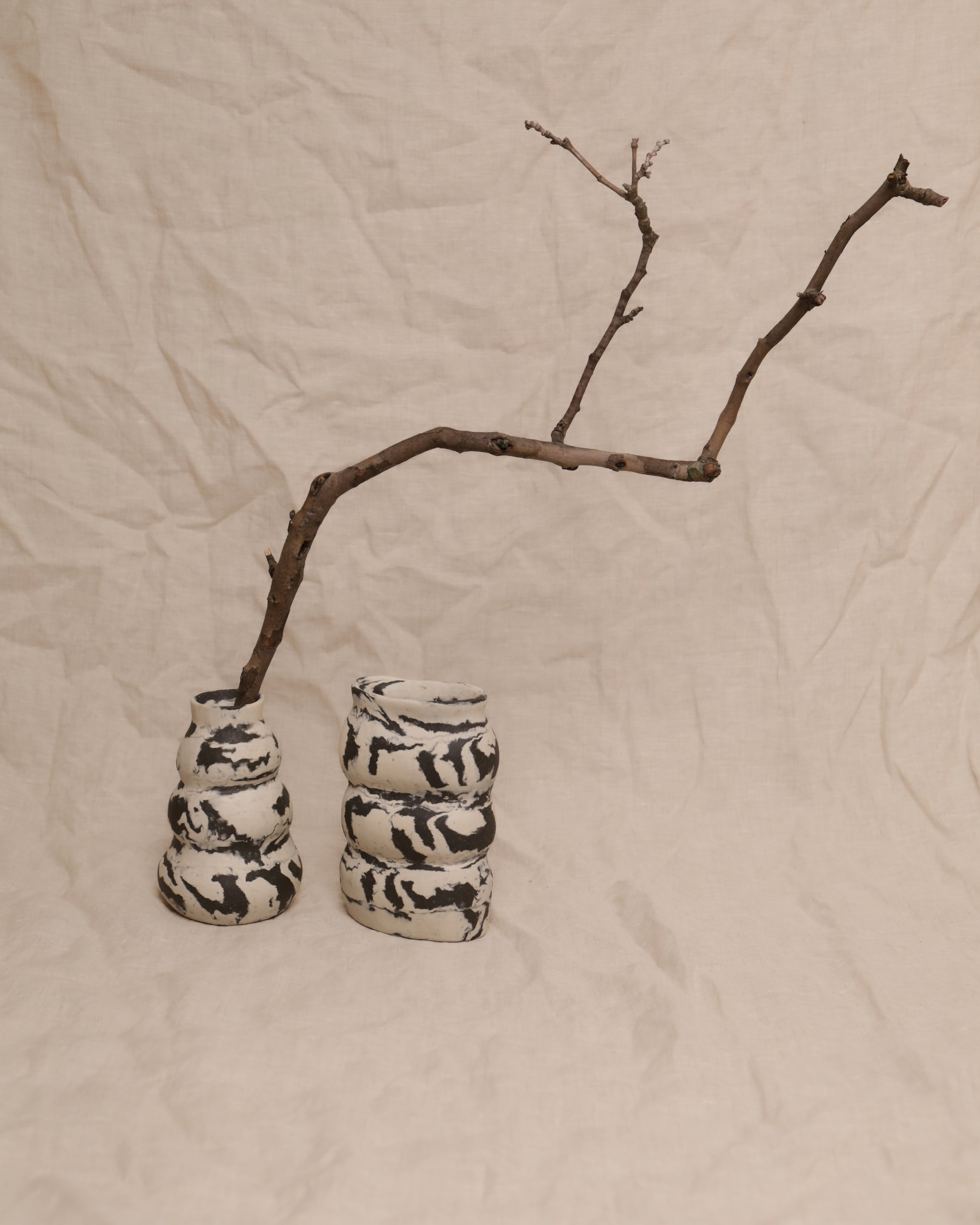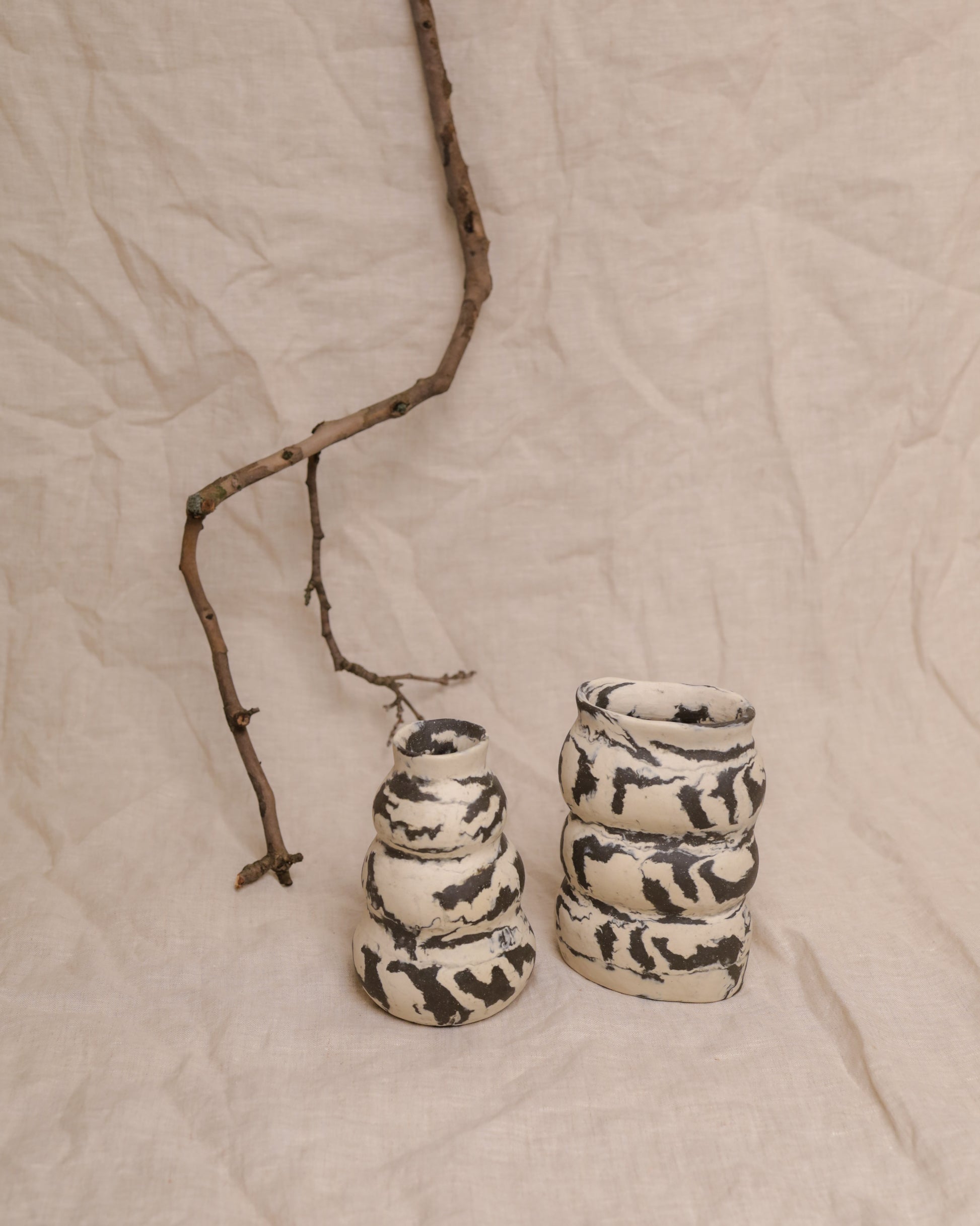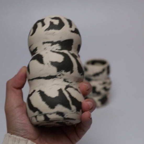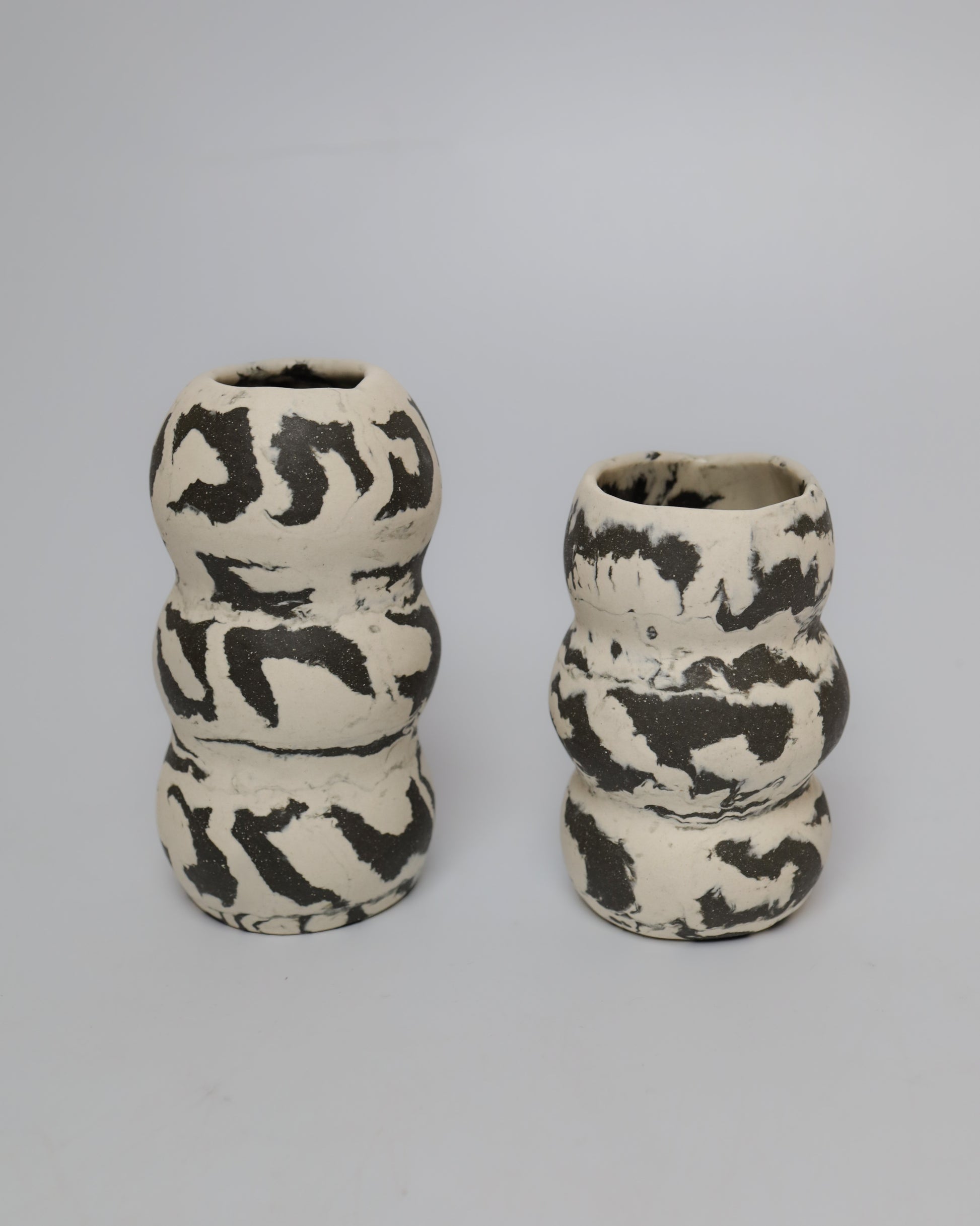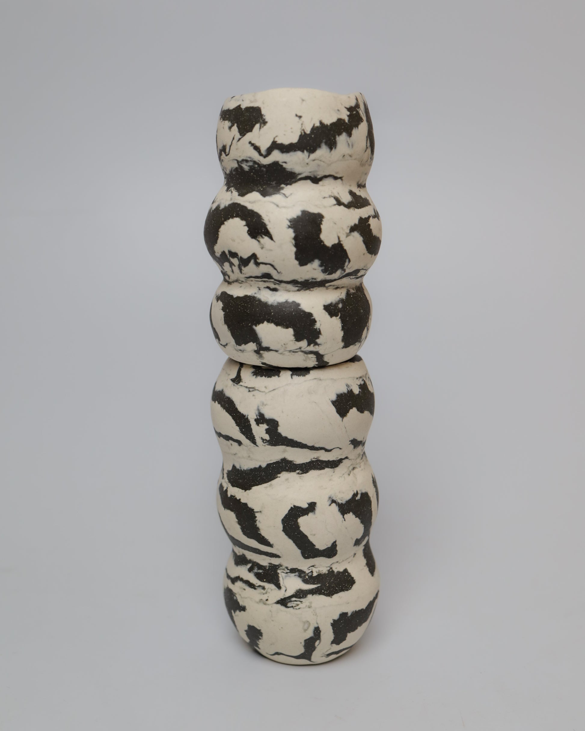 This series features sculptural ceramic vessels that showcase a striking contrast between form and surface. Each piece is crafted with a bulbous, stacked silhouette, creating a rhythmic vertical flow that draws the eye. The surface design is defined by a bold marbled pattern in black and off-white, evoking a sense of organic movement reminiscent of ink swirling through water or abstract calligraphy. The raw texture and irregular lines emphasize the handmade nature of the work, giving each vessel a distinct character. These pieces balance playfulness and sophistication, standing as both functional objects and expressive sculptural forms.