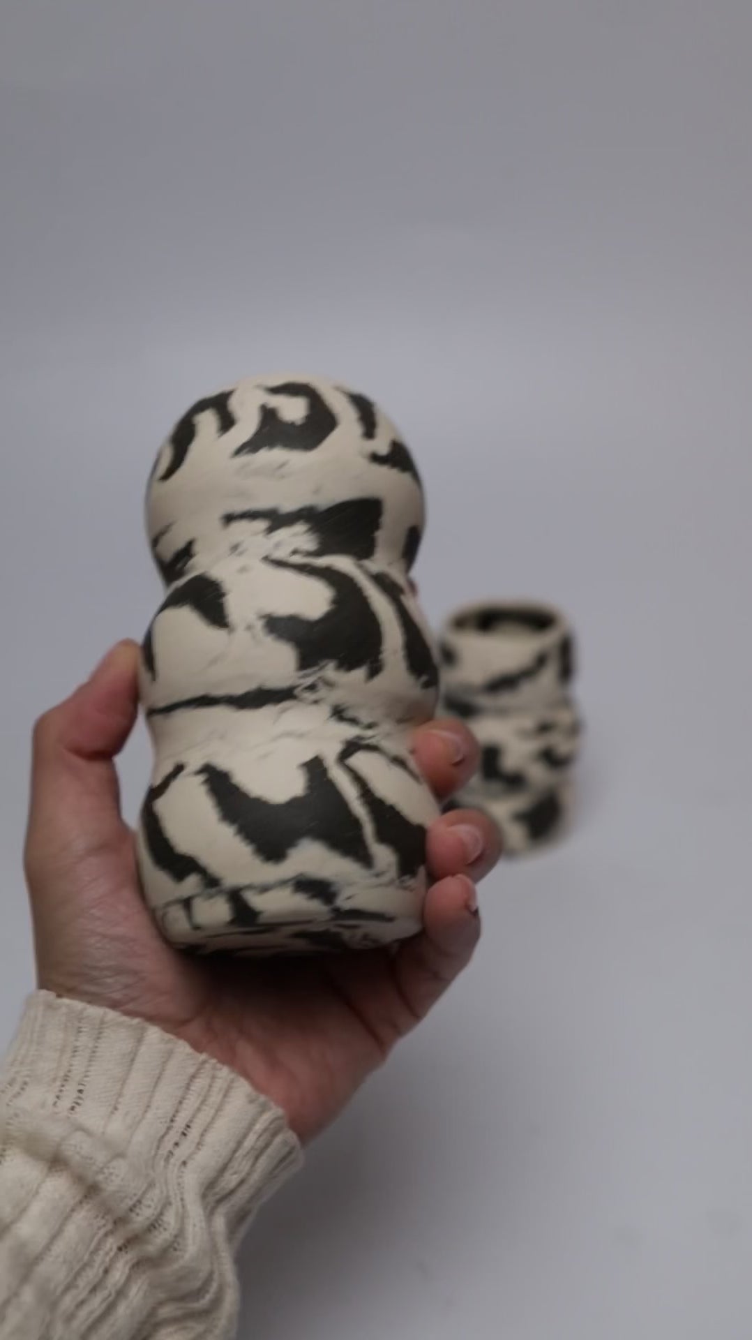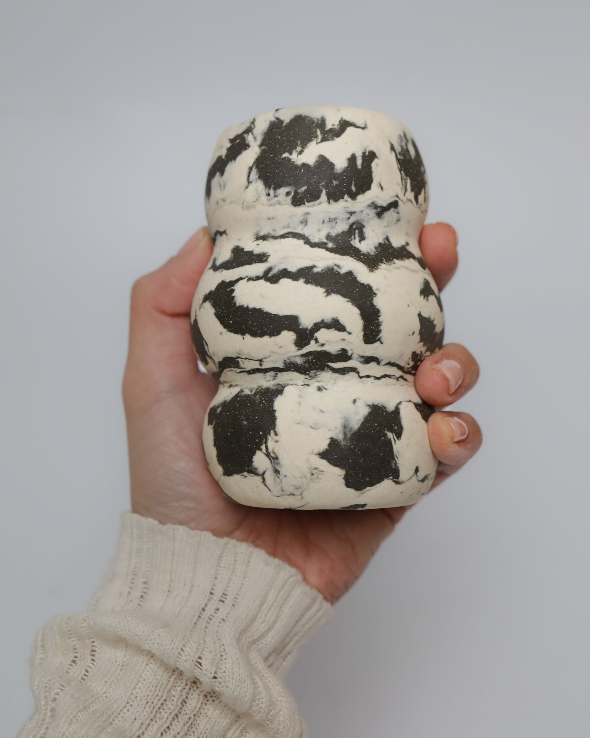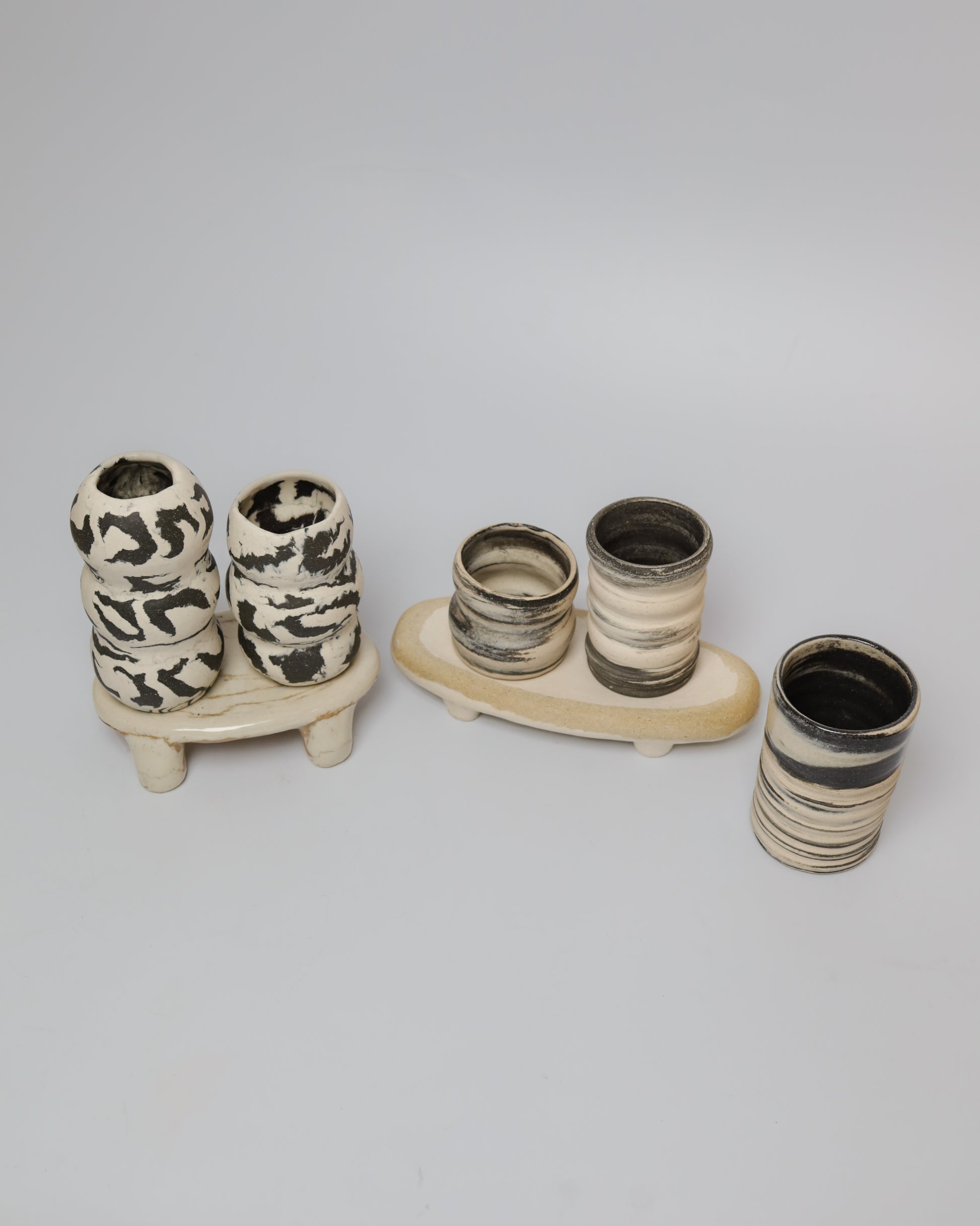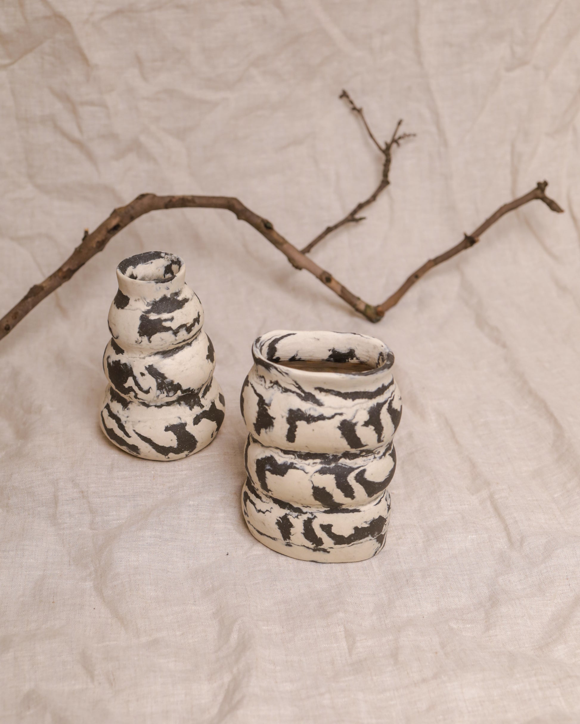 This series features sculptural ceramic vessels that showcase a striking contrast between form and surface. Each piece is crafted with a bulbous, stacked silhouette, creating a rhythmic vertical flow that draws the eye. The surface design is defined by a bold marbled pattern in black and off-white, evoking a sense of organic movement reminiscent of ink swirling through water or abstract calligraphy. The raw texture and irregular lines emphasize the handmade nature of the work, giving each vessel a distinct character. These pieces balance playfulness and sophistication, standing as both functional objects and expressive sculptural forms.