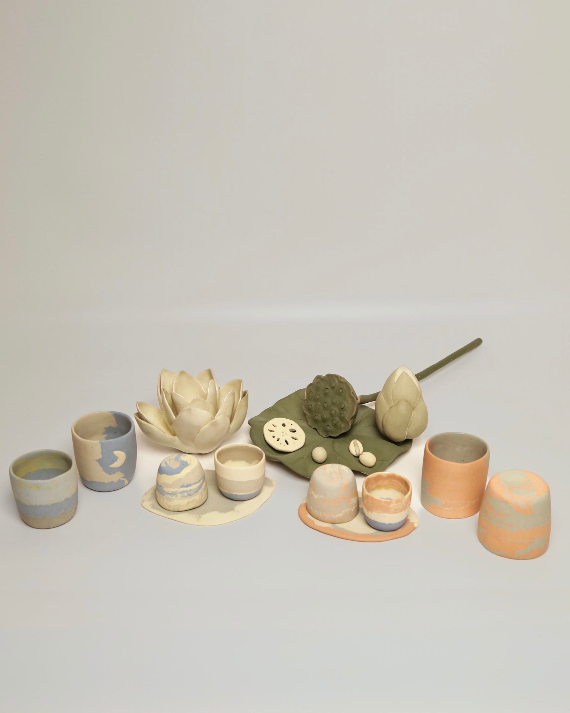 ‘summer in huế’ collection - inspired by my hometown in Vietnam 🇻🇳. Includes all things lotus 🪷, leaf coasters and sunset inspired petite tea cups which are what we use to drink hot tea. Since you only pour a lil tea at a time, it helps keep the drink hot for a long time. All pieces were hand-built using multiple clay bodies and colored clay before getting trimmed and sanded to show off the clays beautiful colors. The cups interiors are glazed with a glossy clear coat and the exteriors are left unglazed. The exteriors were finished with a polish coat of a scented oil-beeswax mix, giving you a nice touch when you enjoy your drink.